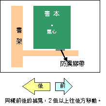 約10㎜薄的防震膠帶貼置於圖書下方,利用地震的能量讓圖書自動往裡移動,利用向裡面的移動力量可防止圖書從書架上掉落。(注意:和擋住前方東西使其傾倒的方法不同)